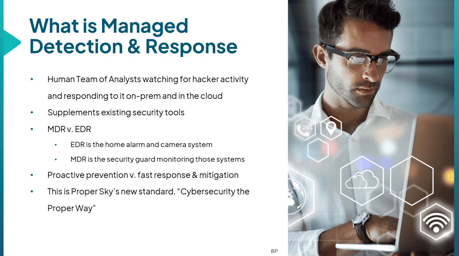 Thank you to everyone who joined our recent Managed Detection and Response (MDR) Cybersecurity webinar featuring special guest Nicole LaDue from BlackPoint. We appreciate all our clients who took time out of their day to attend and engage with us on such an important topic.